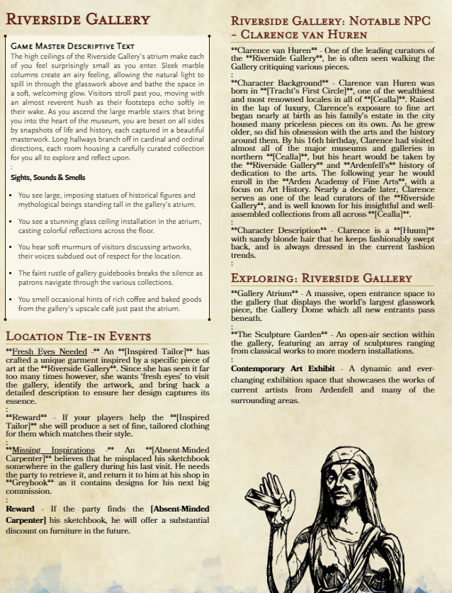 We currently leverage Google Docs for writing & editing, broken out by each setting guide or adventure module, and InDesign for, well, layout design. We've currently transcribed six of twelve working documents, and after making the first template, all of the subsequent drafts are coming along a bit quicker. Attached below is a cleaned up template with some general ideas for how we design and describe our setting guide locations. While it sounds very obvious as I write this, I must say that creating templates for our repeated products has been hugely beneficial, especially with a smaller team of writers.